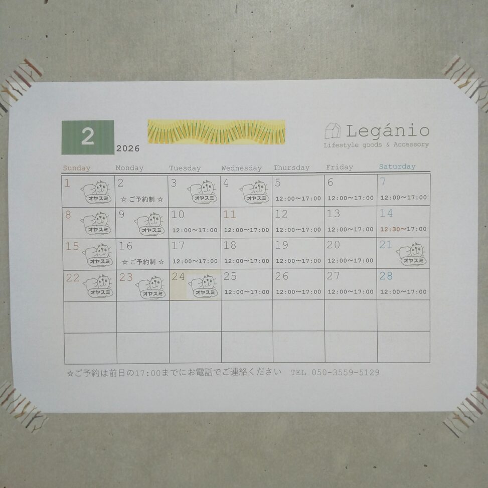 2月の営業日に変更がございますので、お知らせいたします。
