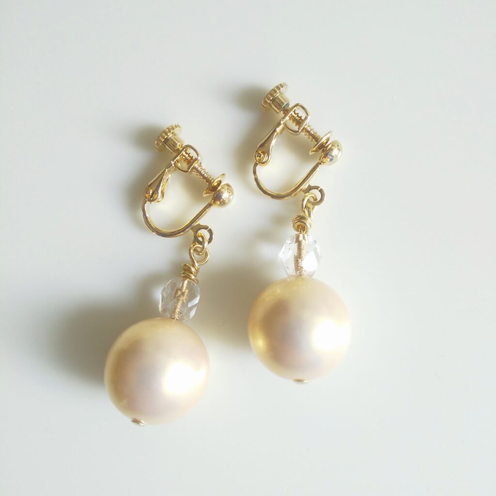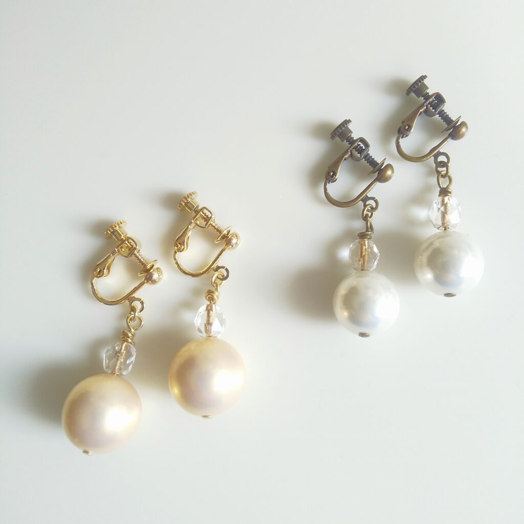 少し大きめ(1.2〜1.4cm)の樹脂パールに、カットクリスタルを組み合わせた、華やかな雰囲気のイヤリングを2種ご用意しております。