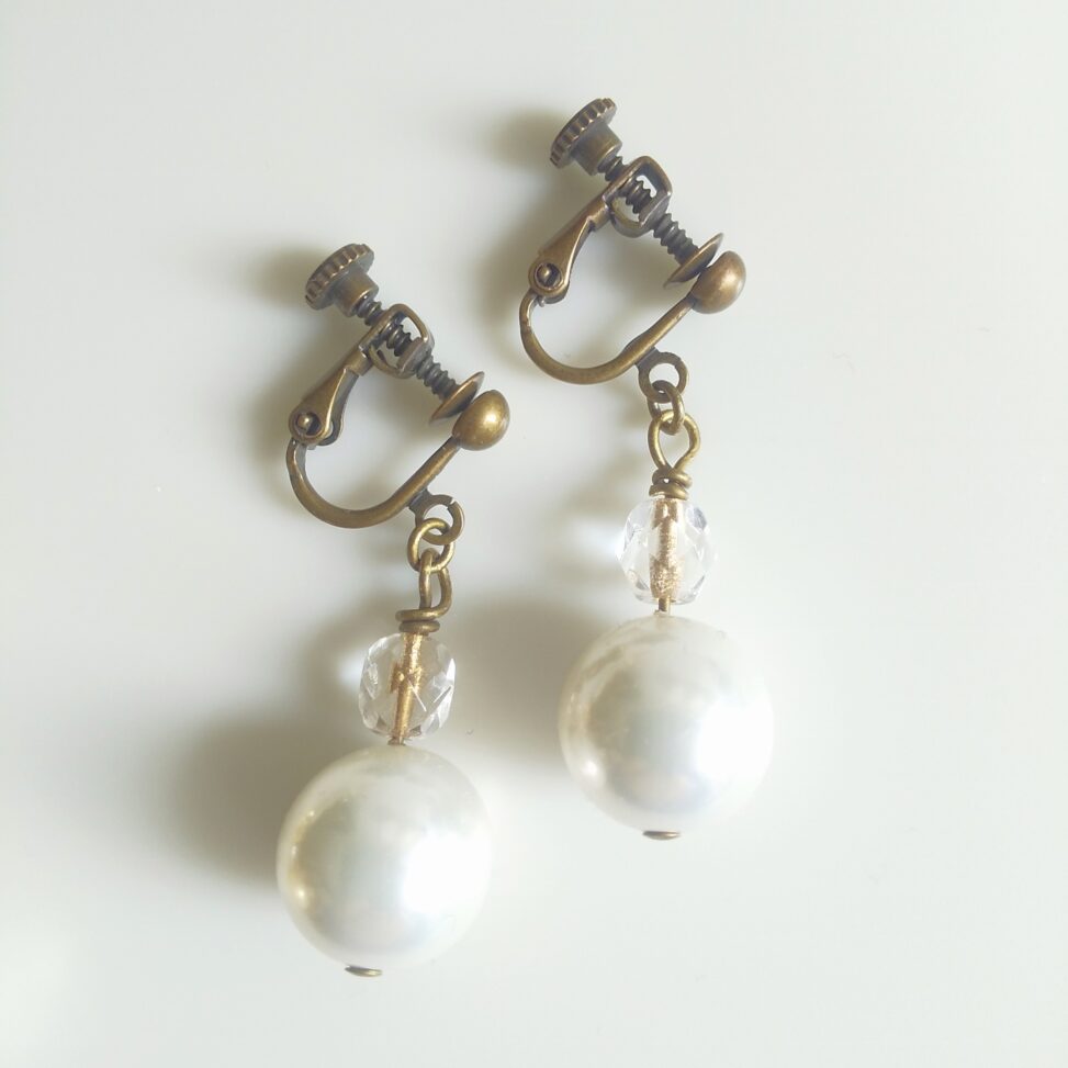少し大きめ(1.2〜1.4cm)の樹脂パールに、カットクリスタルを組み合わせた、華やかな雰囲気のイヤリングを2種ご用意しております。